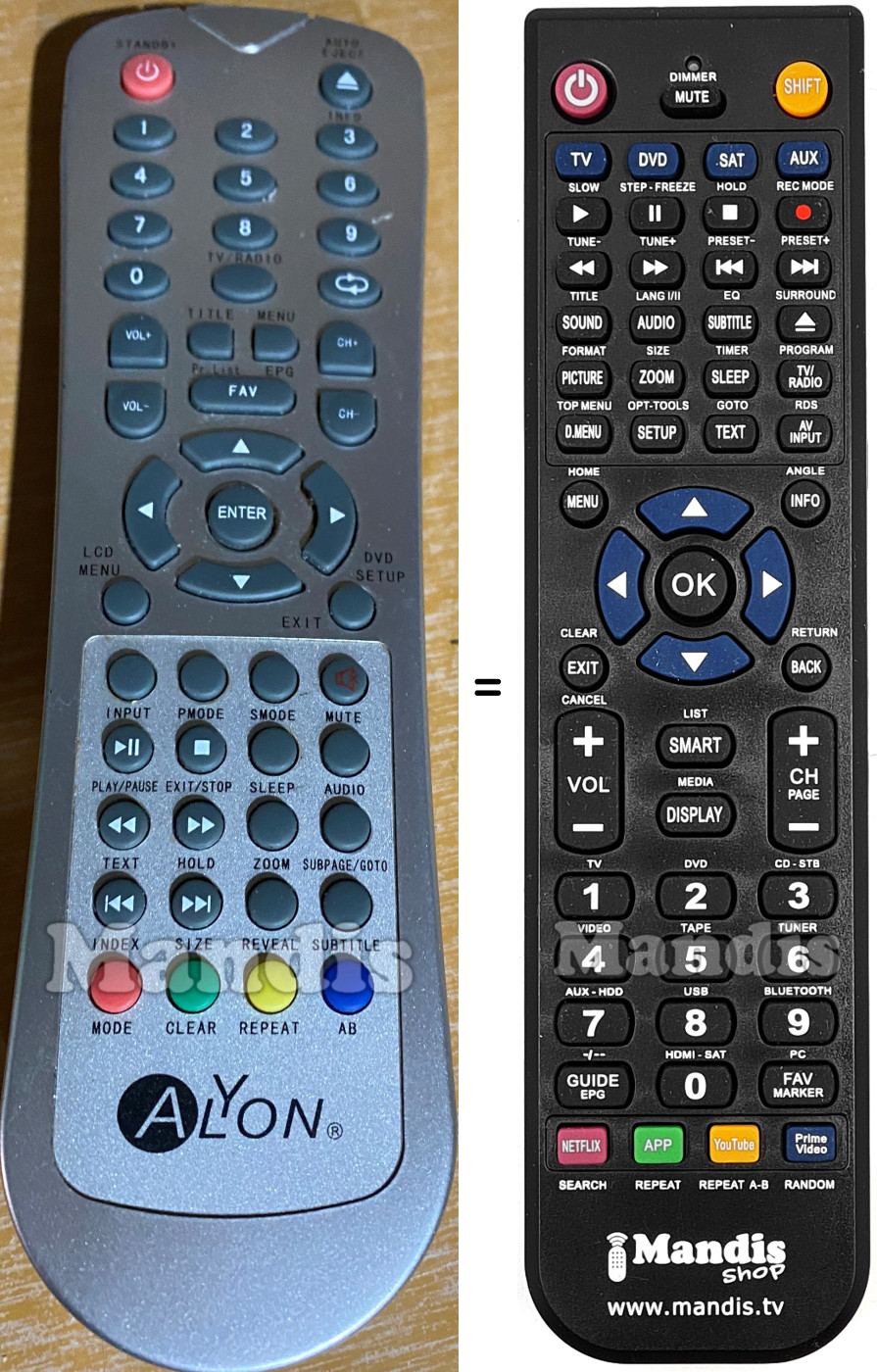 Below, we will show you the correspondence between each button on the original remote control and the button that performs the same function on the replacement remote control. In some cases, you may need to press the SHIFT key before pressing another button to perform certain actions. These additional functions are often not widely used and are included to facilitate understanding of the replacement remote control, or because the original remote control has more buttons than its equivalent.