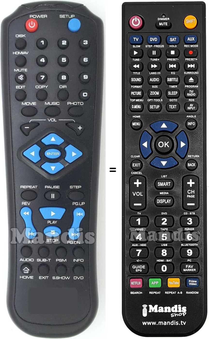 Below, we will show you the correspondence between each button on the original remote control and the button that performs the same function on the replacement remote control. In some cases, you may need to press the SHIFT key before pressing another button to perform certain actions. These additional functions are often not widely used and are included to facilitate understanding of the replacement remote control, or because the original remote control has more buttons than its equivalent.