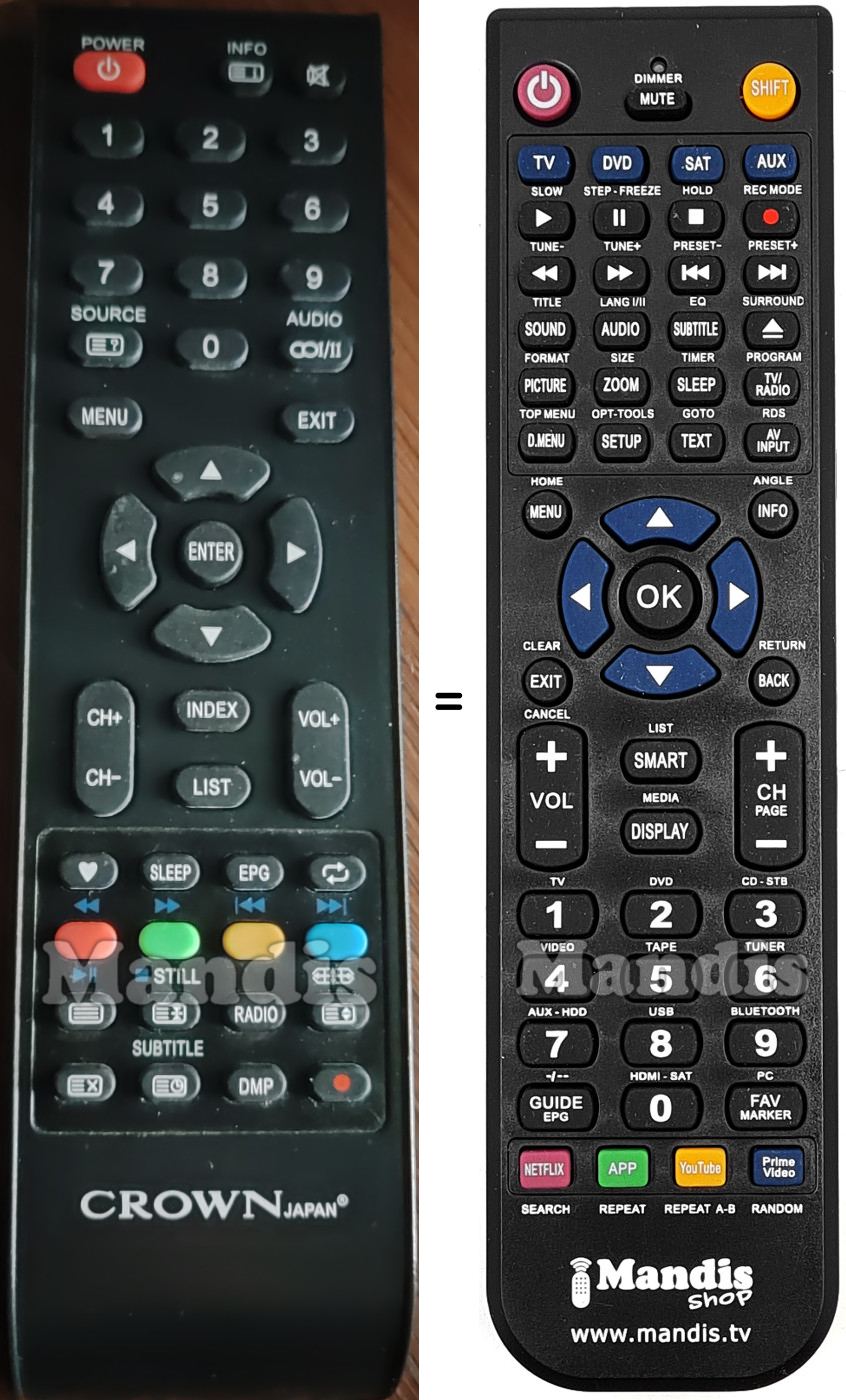 Below, we will show you the correspondence between each button on the original remote control and the button that performs the same function on the replacement remote control. In some cases, you may need to press the SHIFT key before pressing another button to perform certain actions. These additional functions are often not widely used and are included to facilitate understanding of the replacement remote control, or because the original remote control has more buttons than its equivalent.