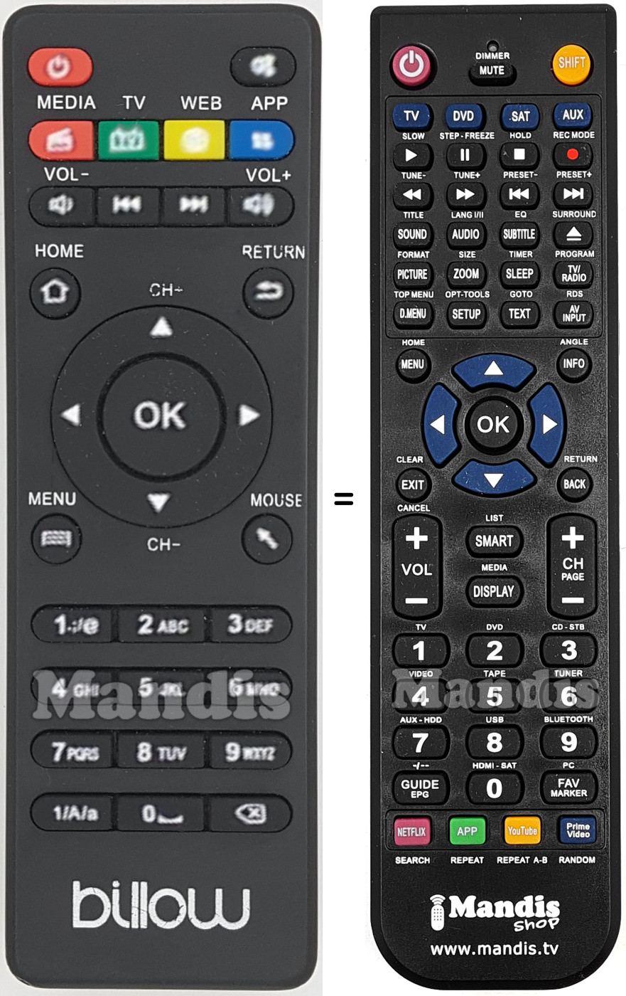 Below, we will show you the correspondence between each button on the original remote control and the button that performs the same function on the replacement remote control. In some cases, you may need to press the SHIFT key before pressing another button to perform certain actions. These additional functions are often not widely used and are included to facilitate understanding of the replacement remote control, or because the original remote control has more buttons than its equivalent.
