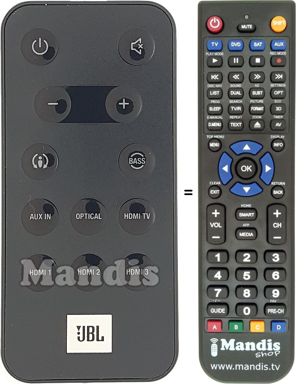 Below, we will show you the correspondence between each button on the original remote control and the button that performs the same function on the replacement remote control. In some cases, you may need to press the SHIFT key before pressing another button to perform certain actions. These additional functions are often not widely used and are included to facilitate understanding of the replacement remote control, or because the original remote control has more buttons than its equivalent.
