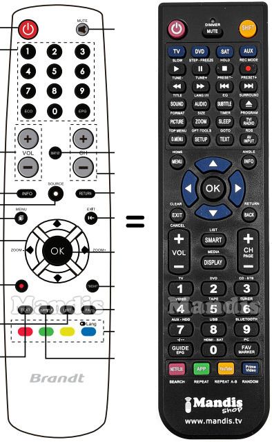 Below, we will show you the correspondence between each button on the original remote control and the button that performs the same function on the replacement remote control. In some cases, you may need to press the SHIFT key before pressing another button to perform certain actions. These additional functions are often not widely used and are included to facilitate understanding of the replacement remote control, or because the original remote control has more buttons than its equivalent.
