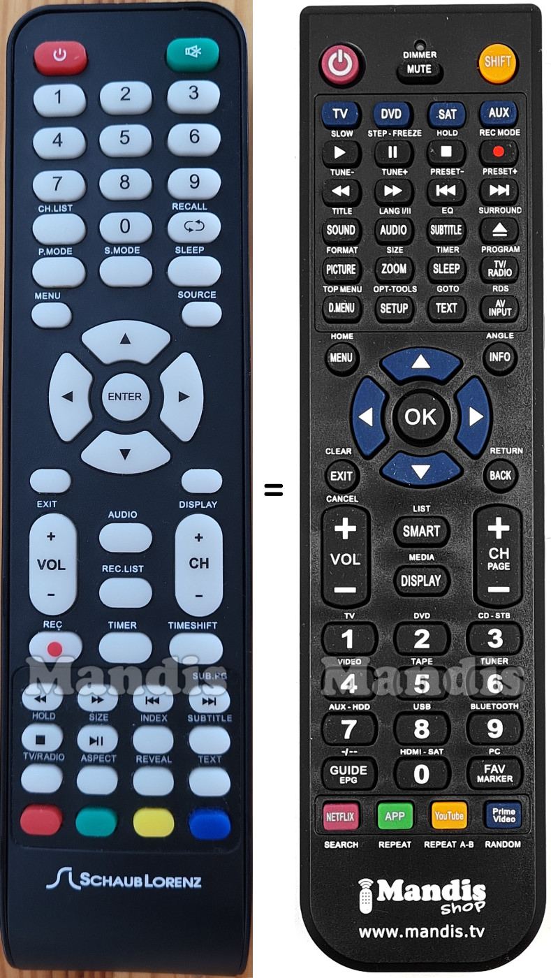 Below, we will show you the correspondence between each button on the original remote control and the button that performs the same function on the replacement remote control. In some cases, you may need to press the SHIFT key before pressing another button to perform certain actions. These additional functions are often not widely used and are included to facilitate understanding of the replacement remote control, or because the original remote control has more buttons than its equivalent.