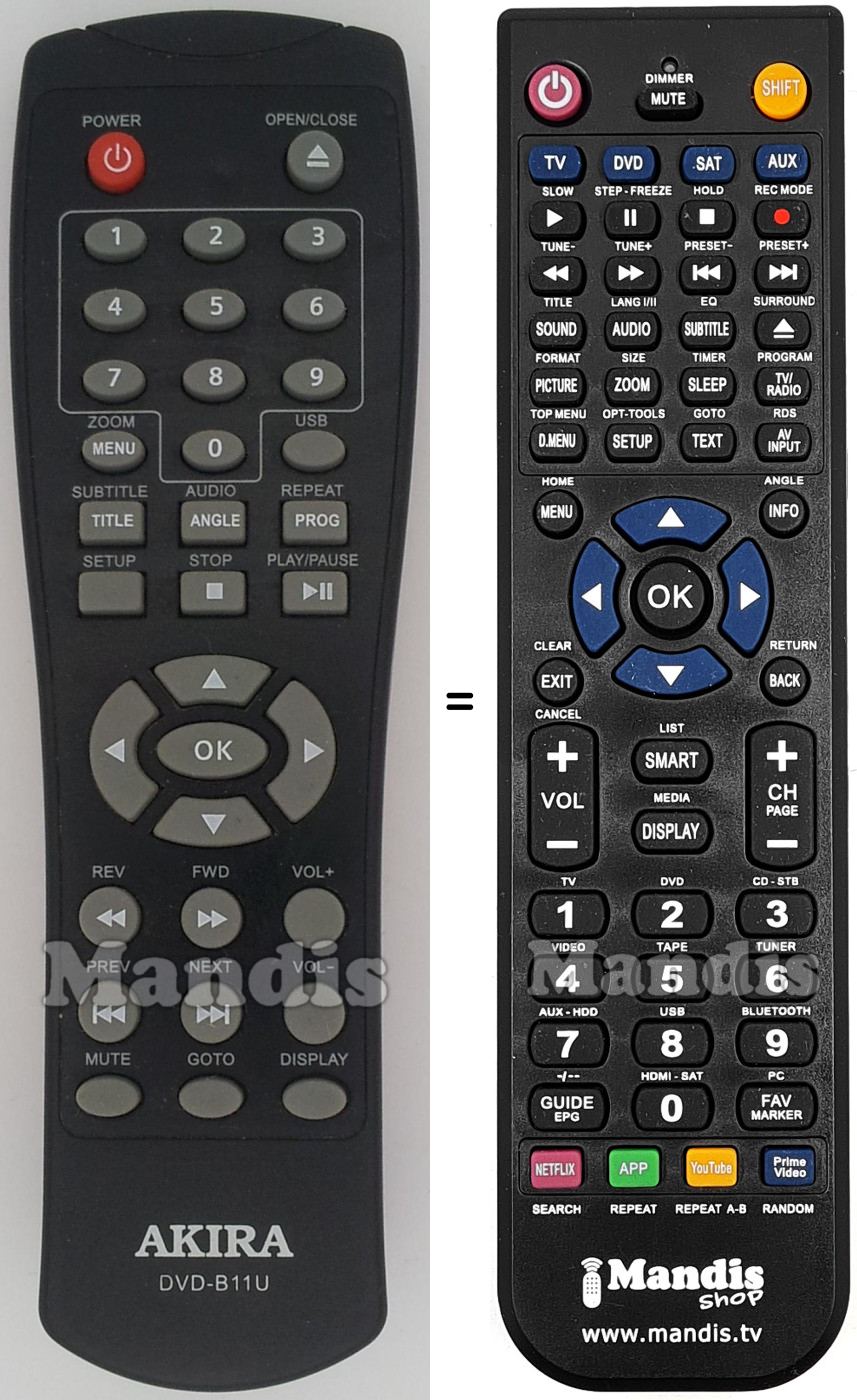 This remote control fully replaces your DVD-B11U and offers all the functions of the original.