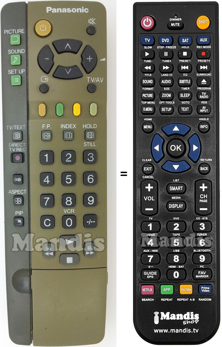 Below, we will show you the correspondence between each button on the original remote control and the button that performs the same function on the replacement remote control. In some cases, you may need to press the SHIFT key before pressing another button to perform certain actions. These additional functions are often not widely used and are included to facilitate understanding of the replacement remote control, or because the original remote control has more buttons than its equivalent.