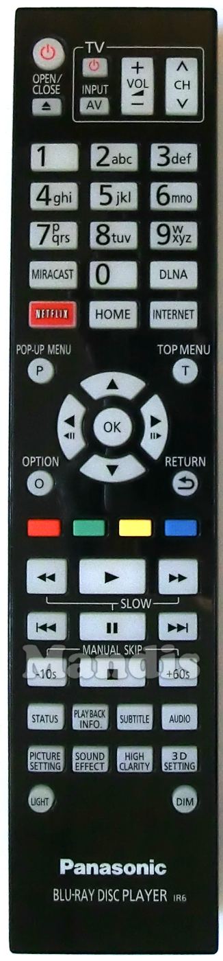 Power, Open / Close, TV Power, TV Vol+, TV Vol-, TV CH+, TV CH-, TV AV/Input, 1, 2, 3, 4, 5, 6, 7, 8, 9, 0, Miracast, DLNA, Netflix, Home, Internet, PopUp Menu, Top Menu, Up, Left, OK, Right, Down, Option, Return, Red, Green, Yellow, Blue, <<, Play, >>, I<<, Pause, >>I, -10s, Stop, +60s, Status, Play Back Info., Subtitle, Audio, Picture Setting, Sound Effect, High Clarity, 3D Setting, Light, DIM