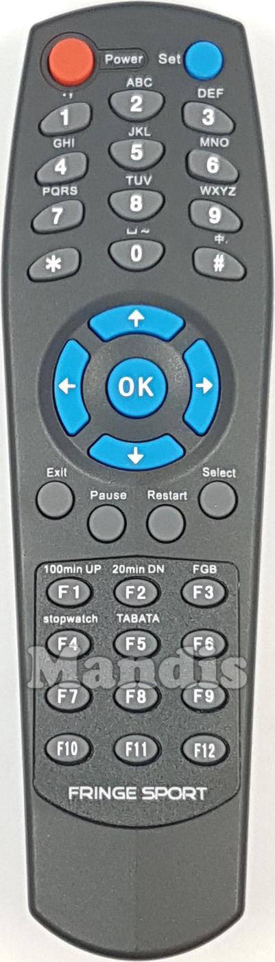 Power, Set, 1, 2, 3, 4, 5, 6, 7, 8, 9, 0, *, #, Up, Down, Right, Left, Exit, Pause, Restart, Select, F1/100min UP, F2/20min DN, F3/FGB, F4/stopwatch, F5/Tabata, F6, F7, F8, F9, F10, F11, F12, OK