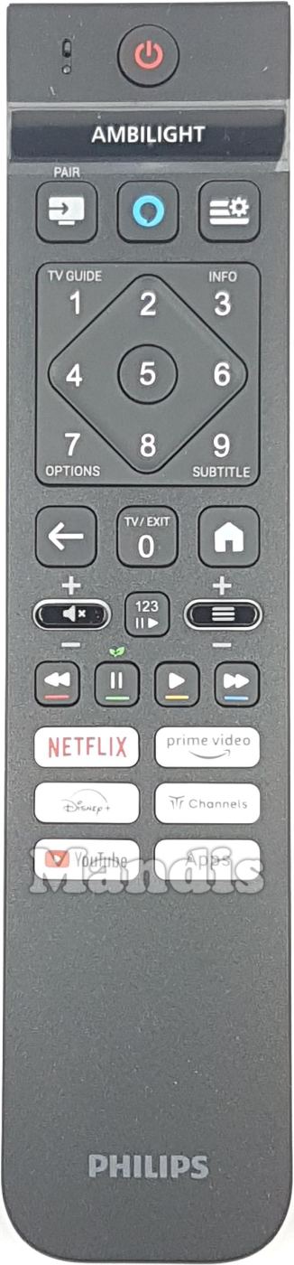 Power, Ambilight, Source/Pair, O, =*, 1/Tv Guide, 2/Up, 3/Info, 4/Left, 5/OK, 6/Right, 7/Options, 8/Down, 9/Subtitle, ←, 0/Tv/Exit, Home, Vol+, Vol-, Mute, CH+, CH-, =, Red/<<, Green/Pause, Yellow/Play, Blue/>>, Netflix, prime video, Disney+, CHannels, YouTube, Apps, 123/Pause/Play