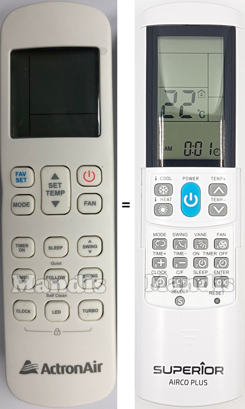 My LG air-conditioner's remote died and need replacement. AircoPlus did the job. I should point out that the code match did not correspond according to manufacturer's table. Let the auto-search code set up do the work. Also, excellent service by Mandis Remotes with a well-protected package.