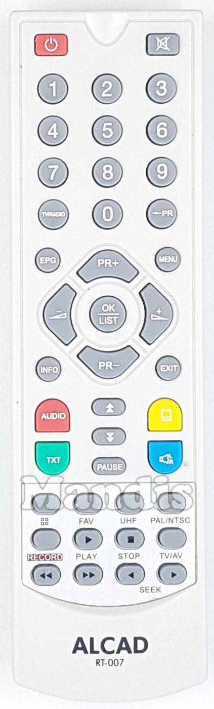 Power, Mute, 1, 2, 3, 4, 5, 6, 7, 8, 9, 0, Tv/Radio, ←PR, Menu, EPG, Info, Exit, ↑, ↓, Up/PR+, Down/PR-, OK/List, Right/Vol+, Left/Vol-, Red/Audio, Yellow/[...], Blue/Audio, Green/TXT, Pause, [+], FAV, UHF, PAL/NTSC, Record, Play, Stop, TV/AV, <<, >>, < Seek, Seek >
