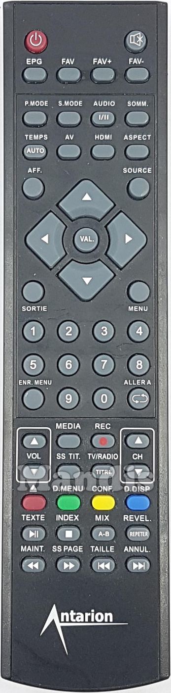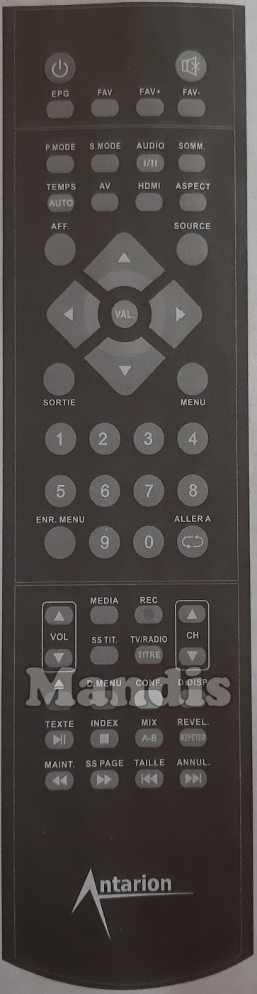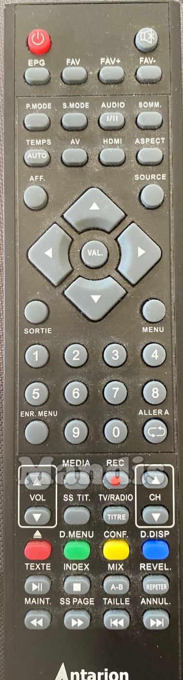 Power, Mute, EPG, FAV, FAV+, FAV-, P.Mode, S.Mode, Audio, Somm., Auto/Temps, AV, HDMI, Aspect, AFF., Source, Menu, Sortie, Up, Down, VAL., Right, Left, 1, 2, 3, 4, 5, 6, 7, 8, 9, 0, Enr. Menu, Aller a, Vol+, Vol-, CH+, CH-, Rec, Media, SS TIT., Tv/Radio, Red/Eject, D.Menu, Yellow/Conf, Blue/D.Disp, Play/PauseTexte, Stop/Index, A-B/Mix, Repeter/Revel., <</Maint., >>/SS Page, I<</Taille, >>I/Annul.