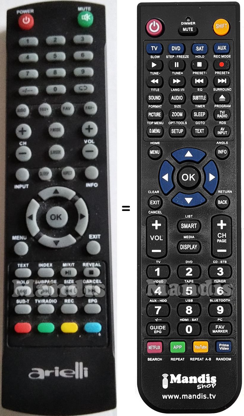 Below, we will show you the correspondence between each button on the original remote control and the button that performs the same function on the replacement remote control. In some cases, you may need to press the SHIFT key before pressing another button to perform certain actions. These additional functions are often not widely used and are included to facilitate understanding of the replacement remote control, or because the original remote control has more buttons than its equivalent.
