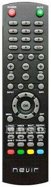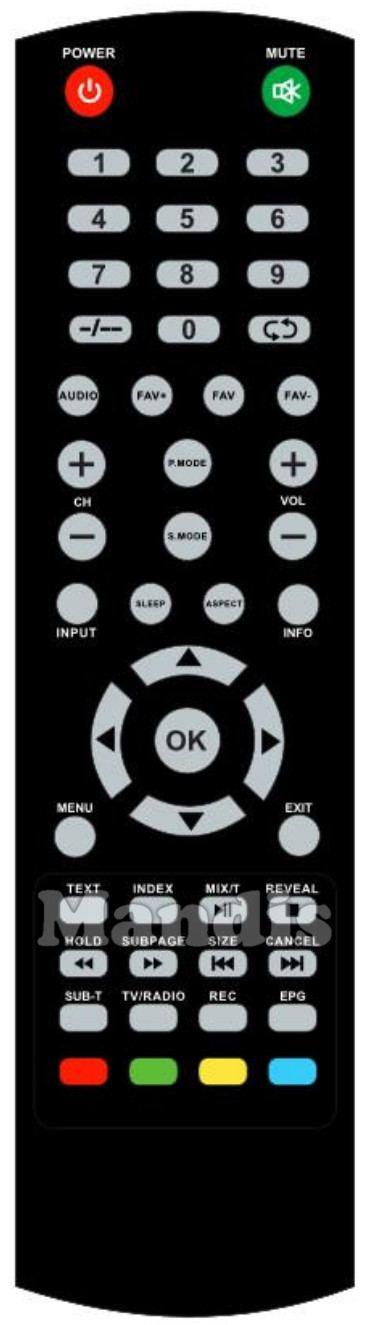 Power, Mute, 1, 2, 3, 4, 5, 6, 7, 8, 9, 0, -/--, Recall, Audio, Fav +, Fav, Fav -, CH +, CH -, P.Mode, S.Mode, Vol +, Vol -, Input, Sleep, Aspect, Info, Up, Down, Right, Left, OK, Menu, Exit, Text, Index, Play / Pause / Mix/T, Stop / Reveal, << / Hold, >> / Subpage, I<< / Size, >>I / Cancel, Sub-T, TV / Radio, Rec, EPG, Red, Green, Yellow, Blue