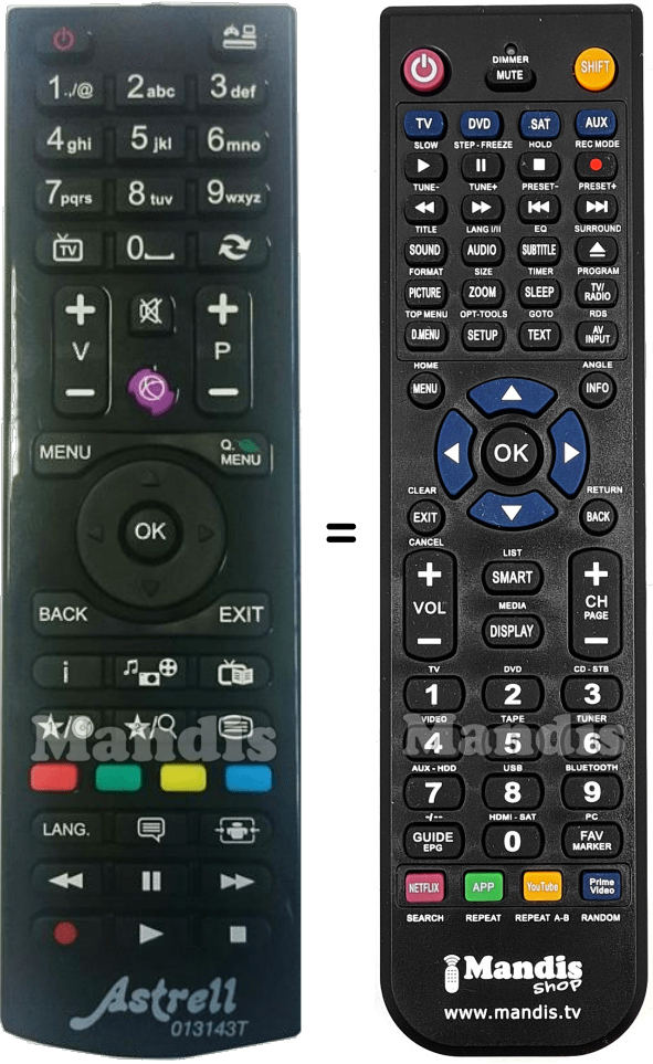 Below, we will show you the correspondence between each button on the original remote control and the button that performs the same function on the replacement remote control. In some cases, you may need to press the SHIFT key before pressing another button to perform certain actions. These additional functions are often not widely used and are included to facilitate understanding of the replacement remote control, or because the original remote control has more buttons than its equivalent.