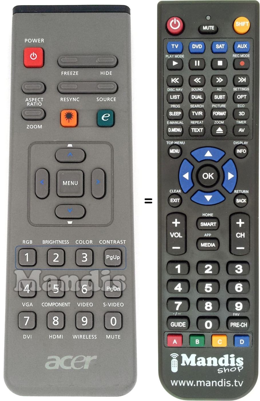 Below, we will show you the correspondence between each button on the original remote control and the button that performs the same function on the replacement remote control. In some cases, you may need to press the SHIFT key before pressing another button to perform certain actions. These additional functions are often not widely used and are included to facilitate understanding of the replacement remote control, or because the original remote control has more buttons than its equivalent.