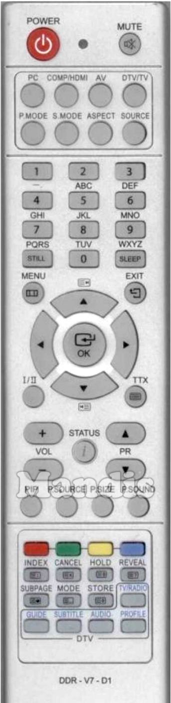 Power, Mute, PC, Comp / HDMI, AV, DTV / TV, P.Mode, S.Mode, Aspect, Source, 1, 2, 3, 4, 5, 6, 7, 8, 9, 0, Still, Sleep, Menu, Exit, Up, Left, OK, Right, Down, I / II, TTX, Vol+, Vol-, Status / i, PR+, PR-, PIP, P.Source, P.Size, P.Sound, Red, Green, Yellow, Blue, Index, Cancel, Hold, Reveal, Subpage, Mode, Store, TV / Radio, Guide, Subtitle, Audio, Profile