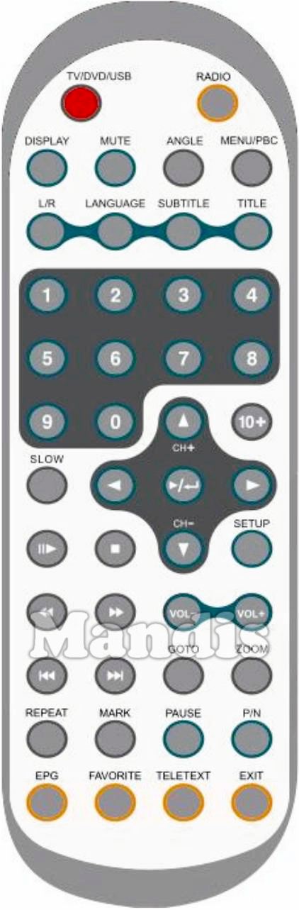 TV / DVD / USB, Radio, Display, Mute, Angle, Menu / PBC, L / R, Language, Subtitle, Title, 1, 2, 3, 4, 5, 6, 7, 8, 9, 0, 10+, Up / CH +, Down / CH -, Left, Right, Play / Enter, Slow, II>, Stop, Setup, <<, >>, Vol -, Vol +, I<<, >>I, Goto, Zoom, Repeat, Mark, Pause, P / N, EPG, Favorite, Teletext, Exit