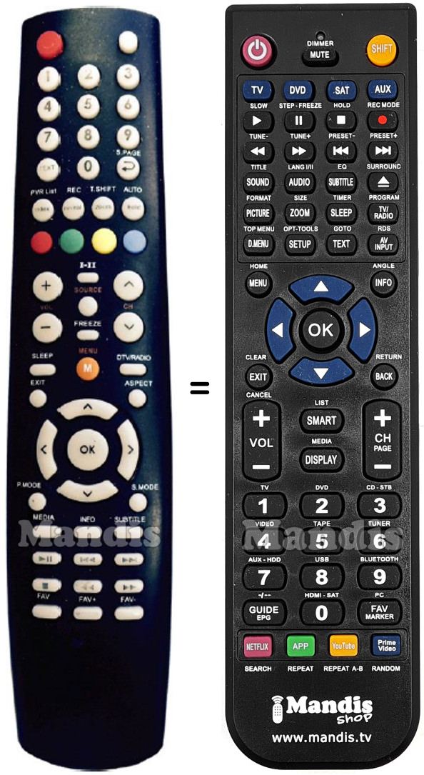 Below, we will show you the correspondence between each button on the original remote control and the button that performs the same function on the replacement remote control. In some cases, you may need to press the SHIFT key before pressing another button to perform certain actions. These additional functions are often not widely used and are included to facilitate understanding of the replacement remote control, or because the original remote control has more buttons than its equivalent.