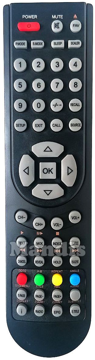 Power, Mute, FAV / Eject, P.Mode, S.Mode, Sleep, Scaler, 1, 2, 3, 4, 5, 6, 7, 8, 9, 0, -/--, Recall, Setup, Exit, Call, Source, Up, Left, OK, Right, Down, CH-, CH+, Vol-, Vol+, Text / Play, Mix / Pause/Play, Index / Stop, I/II, Cancel / <<, REveal / >>, Hold / I<<, Size / >>I, Red / Goto, Green / A-B, Yellow / Repeat, Blue / Angle, S.Page / DVD-Menu, Page- / Title, Page+ / PBC, Audio, i / Display, Radio / Zoom-, EPG / Zoom+, S.Title / Subtitle