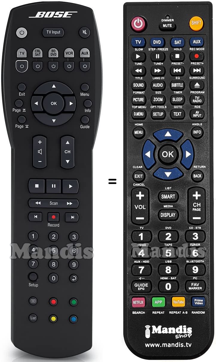 Below, we will show you the correspondence between each button on the original remote control and the button that performs the same function on the replacement remote control. In some cases, you may need to press the SHIFT key before pressing another button to perform certain actions. These additional functions are often not widely used and are included to facilitate understanding of the replacement remote control, or because the original remote control has more buttons than its equivalent.