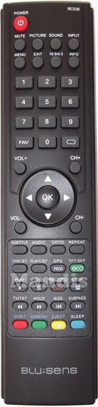 original remote control RC036 used for televisions for the brand Blusens. This is an original remote control.