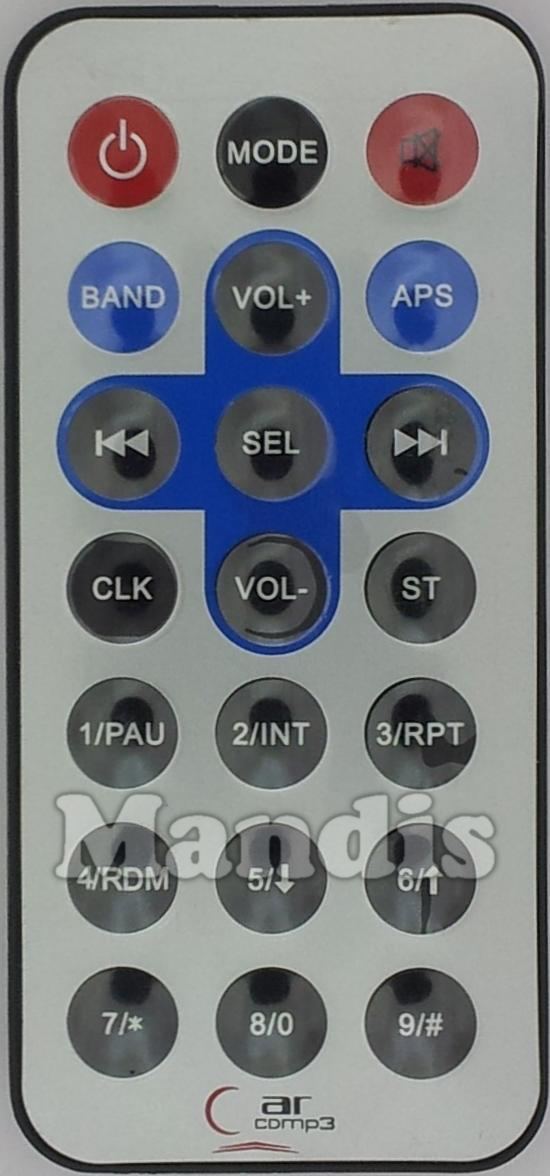 POWER, MODE, MUTE, BAND, APS, CLK, ST, VOL+, VOL-, <<I, I<<, SEL, 1/PAU, 2/INT, 3/RPT, 4/RDM, 5/↓, 6/↑, 7/*, 8/0, 9/#