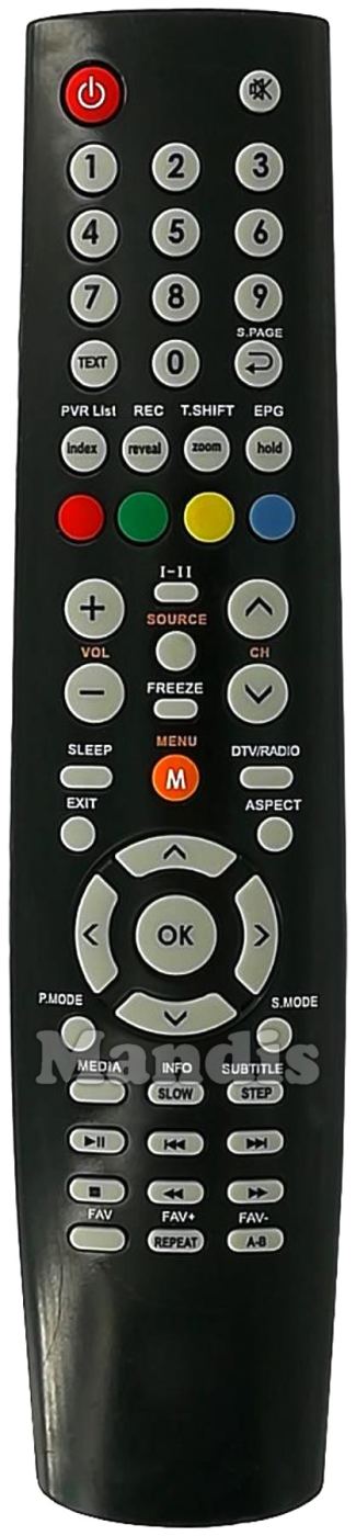Power, Mute, 1, 2, 3, 4, 5, 6, 7, 8, 9, 0, Text, Back / S.Page, index / PVR List, reveal / REC, zoom / T.Shift, hold / EPG, Red, Green, Yellow, Blue, Vol +, Vol -, I-II, Source, Freeze, Menu, CH +, CH -, Sleep, DTV / Radio, Exit, Aspect, Up, Right, Down, Left, OK, P.Mode, S.Mode, Media, Slow / Info, Step / Subtitle, Play / Pause, I<<, >>I, Stop, <<, >>, Fav, Repeat / Fav +, A-B / Fav -