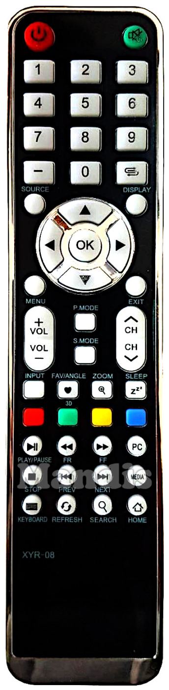 Power, Mute, 1, 2, 3, 4, 5, 6, 7, 8, 9, 0, -, Recall, Source, Display, Up, Left, OK, Right, Down, Menu, Exit, Vol+, Vol-, P.Mode, S.Mode, CH+, CH-, Input, Fav / Angle, Zoom, Sleep, Red, Green / 3D, Yellow, Blue, Play / Pause, FR, FF, PC, Stop, Prev, Next, Media, Keyboard, Refresh, Search, Home