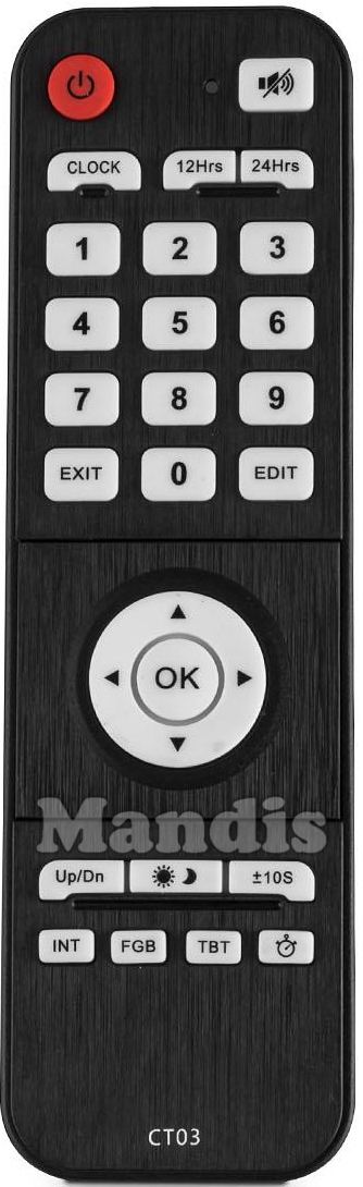 Power, Mute, Clock, 12 Hrs, 24 Hrs, 1, 2, 3, 4, 5, 6, 7, 8, 9, 0, Edit, Exit, Up, Down, Right, Left, OK, Right Up, Right Down, Left Up, Left Down, Up/Dn, ±10s, , INT, FGB, TBT,