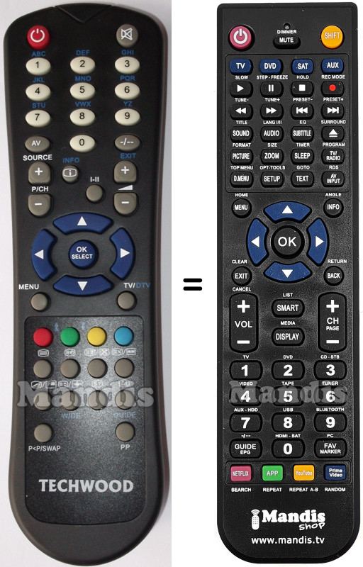 Below, we will show you the correspondence between each button on the original remote control and the button that performs the same function on the replacement remote control. In some cases, you may need to press the SHIFT key before pressing another button to perform certain actions. These additional functions are often not widely used and are included to facilitate understanding of the replacement remote control, or because the original remote control has more buttons than its equivalent.