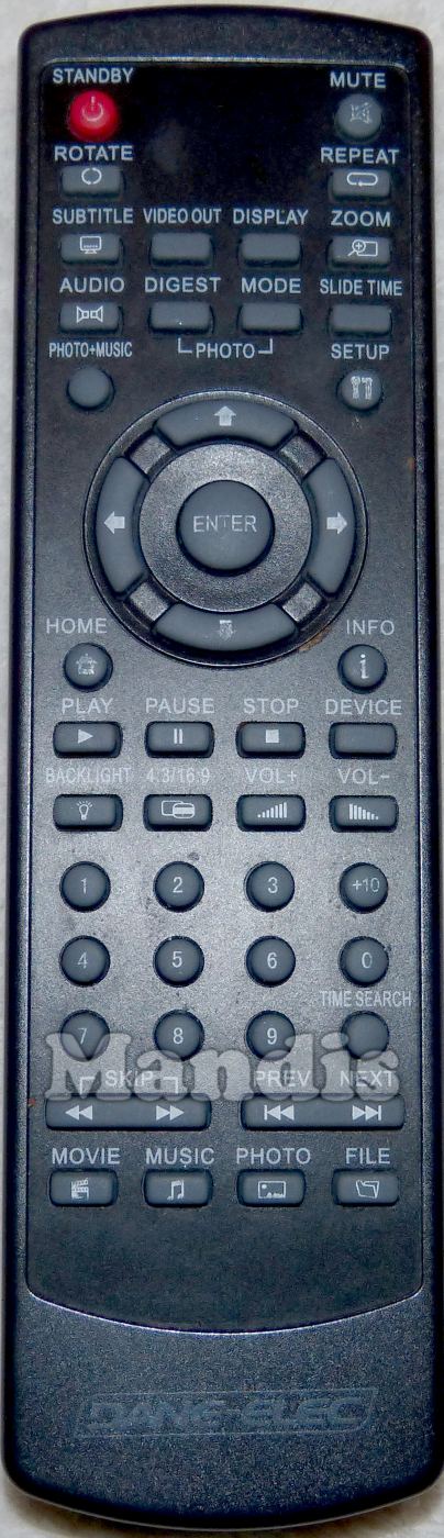 Standby, Mute, Rotate, Repeat, Subtitle, Video Out, Display, Zoom, Audio, Digest, Mode, Slide Time, Photo-Music, Setup, Home, Info, Up, Down, Right, Left, Enter, Play, Pause, Stop, Device, Backlight, 4:3/16:9, Vol+, Vol-, 1, 2, 3, 4, 5, 6, 7, 8, 9, 0, +10, Time Search, << Skip, Skip >>, I<< Prev, Next >>I, Movie, Music, Photo, File