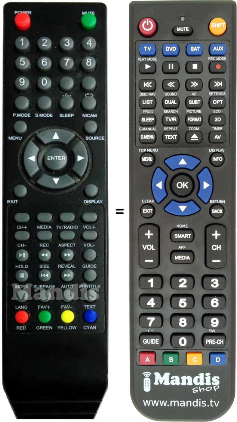 Below, we will show you the correspondence between each button on the original remote control and the button that performs the same function on the replacement remote control. In some cases, you may need to press the SHIFT key before pressing another button to perform certain actions. These additional functions are often not widely used and are included to facilitate understanding of the replacement remote control, or because the original remote control has more buttons than its equivalent.