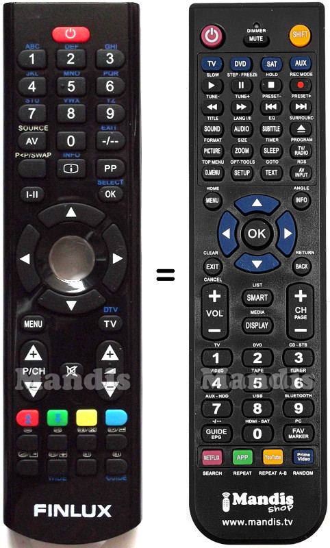 Below, we will show you the correspondence between each button on the original remote control and the button that performs the same function on the replacement remote control. In some cases, you may need to press the SHIFT key before pressing another button to perform certain actions. These additional functions are often not widely used and are included to facilitate understanding of the replacement remote control, or because the original remote control has more buttons than its equivalent.