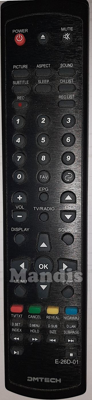 original remote control E26D-01 used for televisions for the brand DMTech. This is an original remote control.