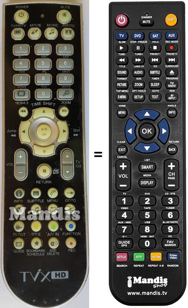 Below, we will show you the correspondence between each button on the original remote control and the button that performs the same function on the replacement remote control. In some cases, you may need to press the SHIFT key before pressing another button to perform certain actions. These additional functions are often not widely used and are included to facilitate understanding of the replacement remote control, or because the original remote control has more buttons than its equivalent.