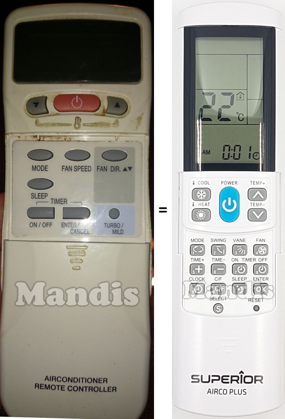 My LG air-conditioner's remote died and need replacement. AircoPlus did the job. I should point out that the code match did not correspond according to manufacturer's table. Let the auto-search code set up do the work. Also, excellent service by Mandis Remotes with a well-protected package.
