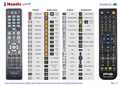 Below, we will show you the correspondence between each button on the original remote control and the button that performs the same function on the replacement remote control. In some cases, you may need to press the SHIFT key before pressing another button to perform certain actions. These additional functions are often not widely used and are included to facilitate understanding of the replacement remote control, or because the original remote control has more buttons than its equivalent.