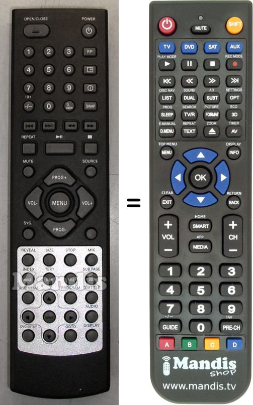 Below, we will show you the correspondence between each button on the original remote control and the button that performs the same function on the replacement remote control. In some cases, you may need to press the SHIFT key before pressing another button to perform certain actions. These additional functions are often not widely used and are included to facilitate understanding of the replacement remote control, or because the original remote control has more buttons than its equivalent.