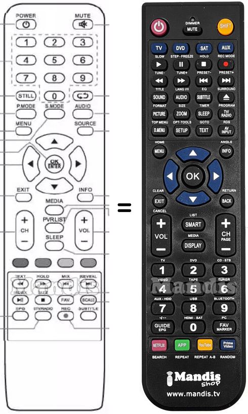 Below, we will show you the correspondence between each button on the original remote control and the button that performs the same function on the replacement remote control. In some cases, you may need to press the SHIFT key before pressing another button to perform certain actions. These additional functions are often not widely used and are included to facilitate understanding of the replacement remote control, or because the original remote control has more buttons than its equivalent.