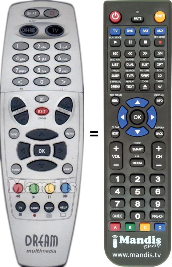 This remote control fully replaces your Dream-multimedia (URC39730) and offers all the functions of the original.