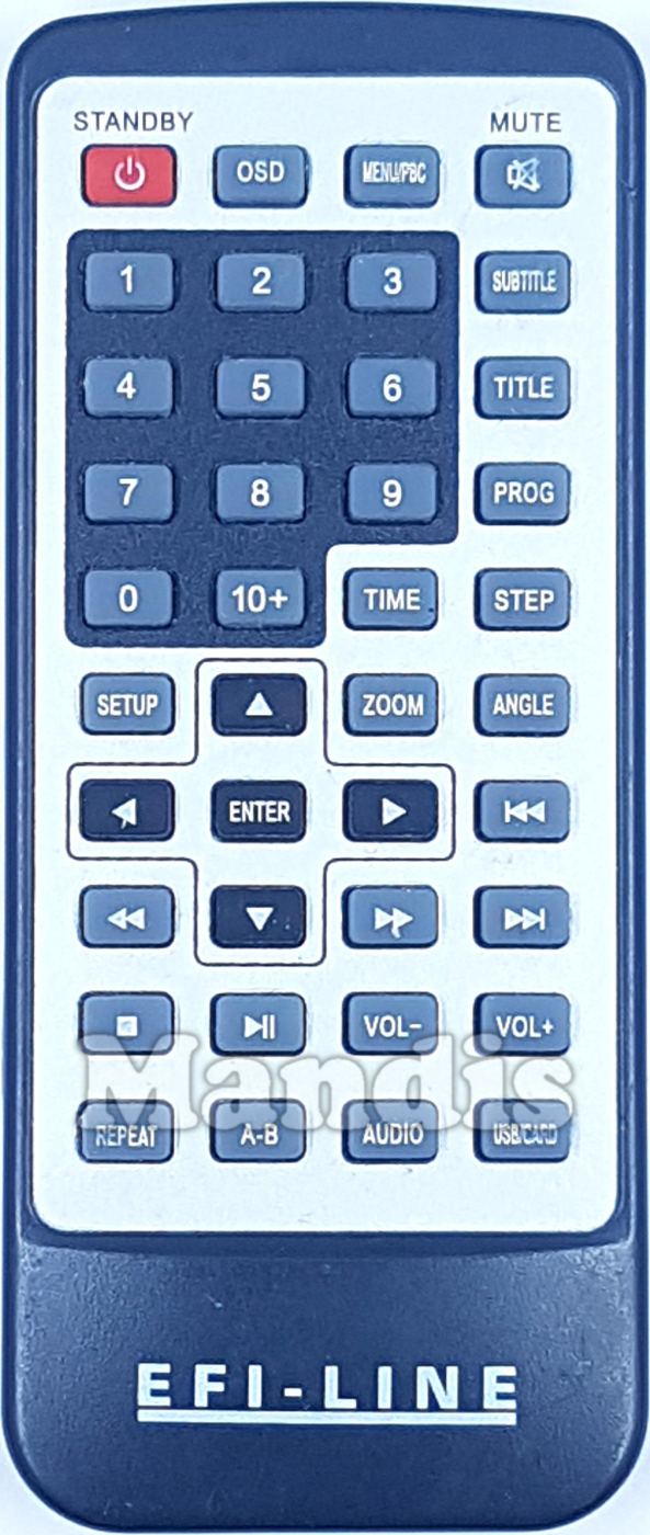 Standby, OSD, Menu/PBC, Mute, Subtitle, Title, PROG, Time, Step, Zoom, Angle, Setup, 1, 2, 3, 4, 5, 6, 7, 8, 9, 0, 10+, Up, Down, Left, Right, Enter, <<, >>, I<<, >>I, Stop, Play/Pause, Vol-, Vol+, Repeat, A-B, Audio, USB/Card