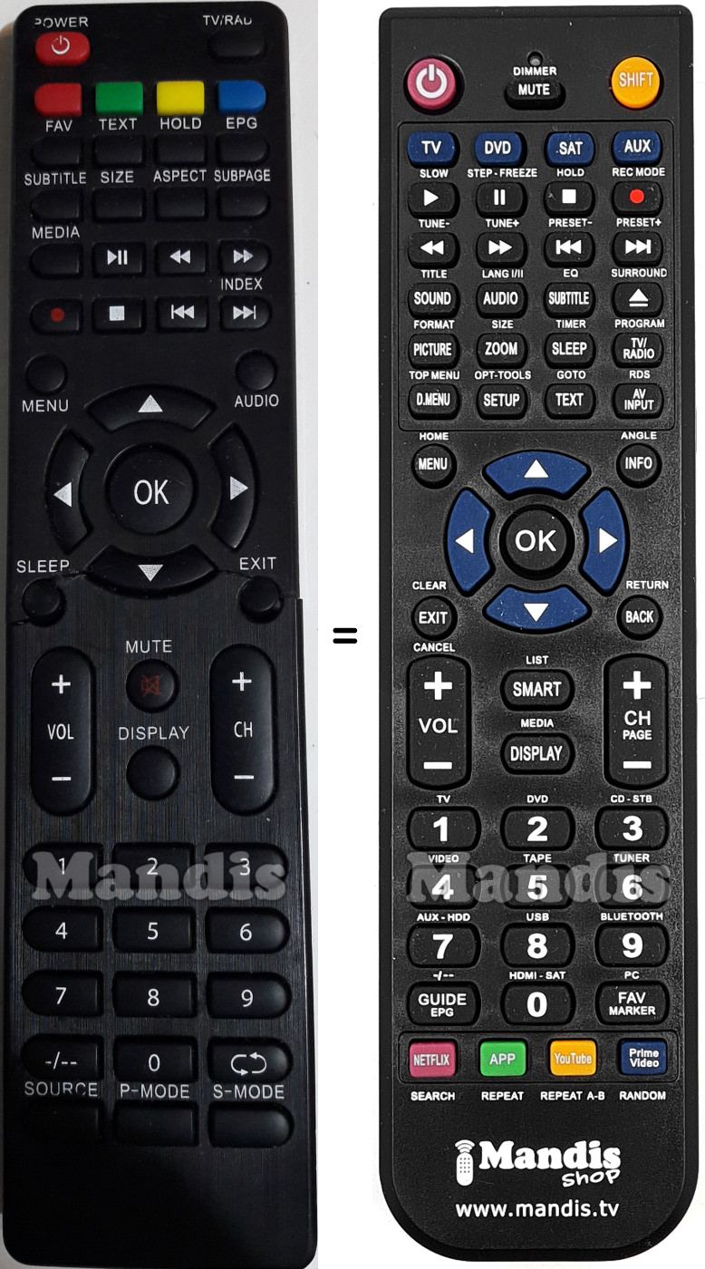 Below, we will show you the correspondence between each button on the original remote control and the button that performs the same function on the replacement remote control. In some cases, you may need to press the SHIFT key before pressing another button to perform certain actions. These additional functions are often not widely used and are included to facilitate understanding of the replacement remote control, or because the original remote control has more buttons than its equivalent.