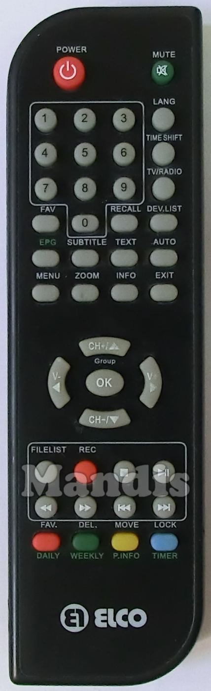 Power, Mute, 1, 2, 3, 4, 5, 6, 7, 8, 9, 0, LANG, Time Shift, TV/Radio, FAV, Recall, DEV.List, EPG, Subtitle, Text, Auto, Menu, Zoom, Info, Exit, CH+/Down/Group, CH-/Down, Vol-/Left, Vol+/Right, OK, Filelist, REC, Rec, Play/Pause, <</Fav., >>/DEL., I<</Move, >>I/Lock, Red/Daily, Green/Weekly, Yellow/P.Info, Blue/Timer