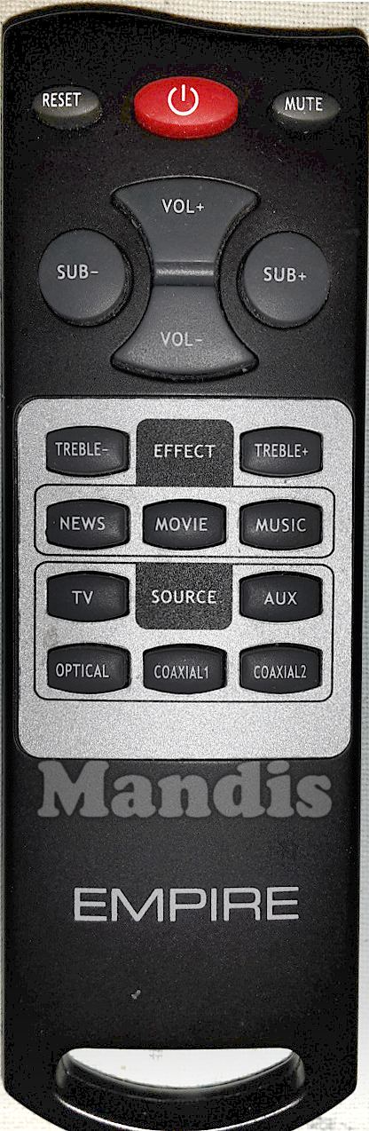 Power, Reset, Mute, Sub-, Sub+, Vol+, Vol-, Treble-, Treble+, Effect NEWS, Effect MOVIE, Effect MUSIC, Source TV, Source OPTICAL, Source COAXIAL1, Source COAXIAL2, Source AUX