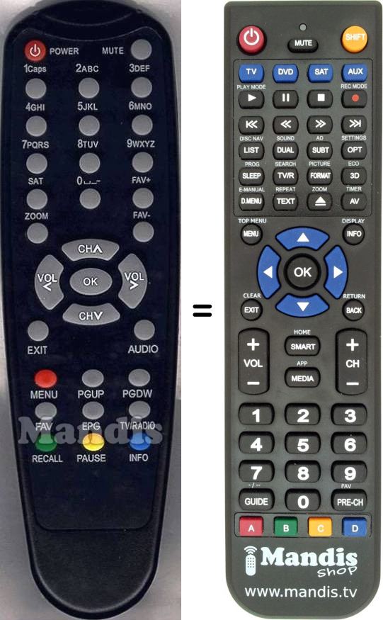 Below, we will show you the correspondence between each button on the original remote control and the button that performs the same function on the replacement remote control. In some cases, you may need to press the SHIFT key before pressing another button to perform certain actions. These additional functions are often not widely used and are included to facilitate understanding of the replacement remote control, or because the original remote control has more buttons than its equivalent.
