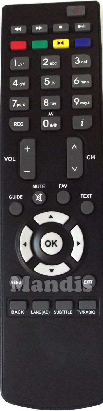 Power, <<, >>, Stop, Play / Pause, Red, Green, Yellow, Blue, 1, 2, 3, 4, 5, 6, 7, 8, 9, 0 / AV, Rec, i, Vol +, Vol -, CH +, CH -, Guide, Mute, Fav, Text, Up, Down, Right, Left, OK, Menu, Exit, Back, Lang (AD), Subtitle, TV / Radio