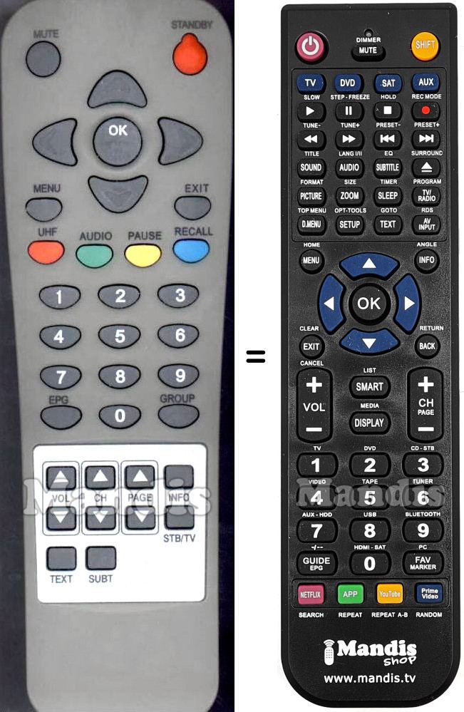 Below, we will show you the correspondence between each button on the original remote control and the button that performs the same function on the replacement remote control. In some cases, you may need to press the SHIFT key before pressing another button to perform certain actions. These additional functions are often not widely used and are included to facilitate understanding of the replacement remote control, or because the original remote control has more buttons than its equivalent.