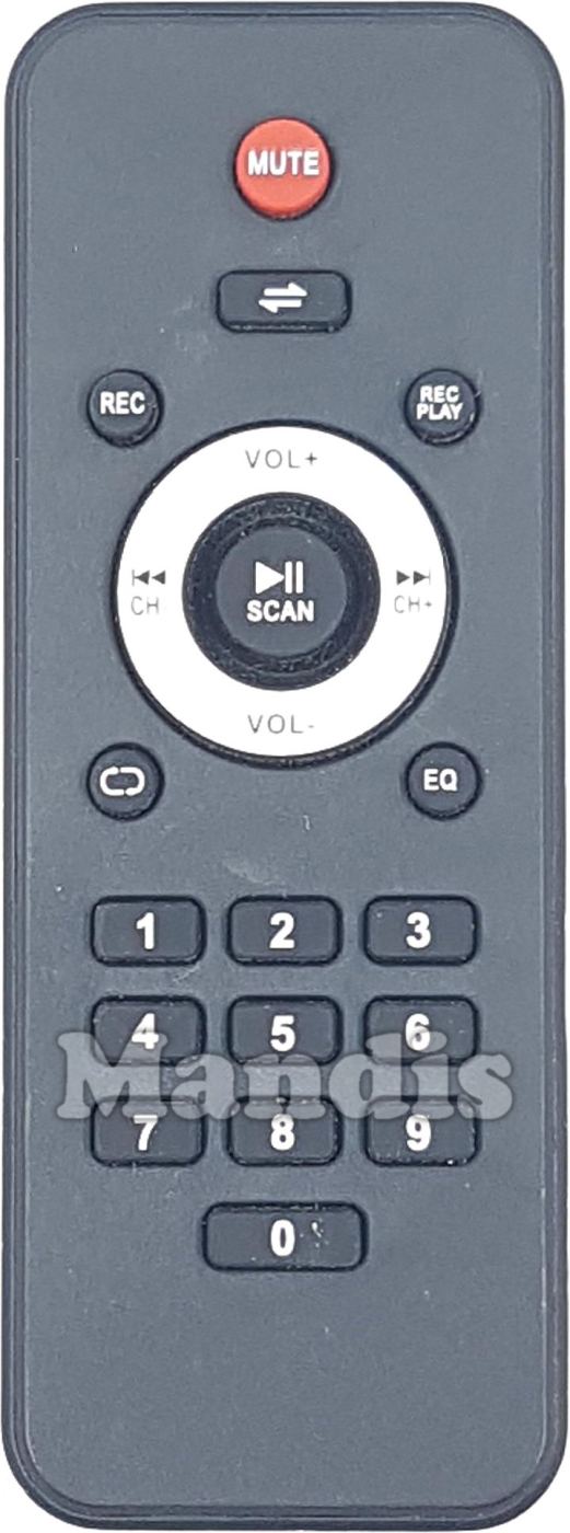 Mute, ⇄, REC, REC Play, Recall, EQ, Vol+, Vol-, I<</CH-, >>I/CH+, Play/Pause/Scan, 1, 2, 3, 4, 5, 6, 7, 8, 9, 0