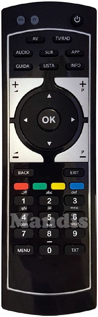 Power, DEC, TV, AV, TV/RAD, Audio, SUB, APP, GUIDA, LISTA, INFO, Vol +, Vol -, P +, P -, Up, Down, Right, Left, OK, Back, Exit, Red, Green, Yellow, Blue, 1, 2, 3, 4, 5, 6, 7, 8, 9, 0, Menu, TXT
