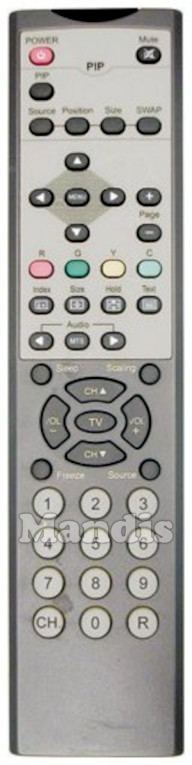 Power, Mute, PIP, PIP Source, PIP Position, PIP Size, PIP Swap, Up, Left, Menu, Right, Down, Page +, Page -, Red, Green, Yellow, Cyan, Index, Size, Hold, Text, Audio -, Audio MTS, Audio +, Sleep, Scaling, CH+, CH-, Vol+, Vol-, TV, Freeze, Source, 1, 2, 3, 4, 5, 6, 7, 8, 9, 0, CH, R